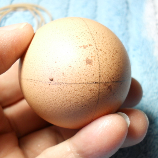 However (now that I’ve gone all OCD on you), we are going to eyeball the first two divisions. Hold the egg with the small end pointing up to the ceiling, center it in your field of vision, and find the topmost peak of the egg. Visualize the curve against whatever background is behind the egg (if you can hold it against a dark background, it is easier to see), and find the center. Make a mark at the apex. Turn the egg upside down and do the same on the bottom of the egg.
