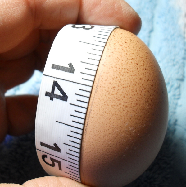 Now measure for symmetry. Pick a number on your measuring tape and hold it against the top mark on your egg with your index finger. Hold the top in place, and align the tape down one of the division lines, smooth the tape down to the bottom mark, keeping it straight and flat against the egg. A common egg will measure about 3 inches and change.
