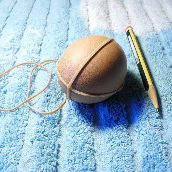 Do the same for the second division. The egg should be divided into four long sections. Like sectioning an orange. You can check it with the rubber band marking method shown above. It’s hard to draw under the bands, but it’s easier to see where your lines are and assure that they are even.